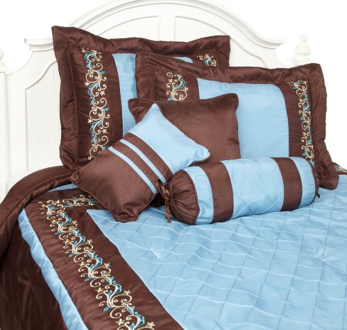 7 Piece Bedding set Elegant Quilting and Embroidery Luxuriously Styled In Style Todays Fashion Colors of Deep Browns and Blues 3 Bonus Pillows