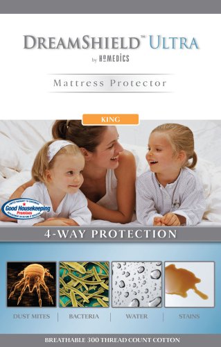 Homedics DSH-UMPK DreamSheild mattress protector king size white DreamSheild ultra white king size mattress protector offers 4-way protection against dust mites water spills stains and bacteria Breathable 300 thread count 100 cotton cover Water and stain resistant Protects against water spills a