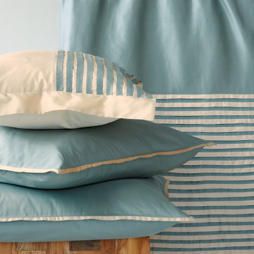 Shimmering dupioni silk in ocean blue is trimmed with rows of silk pleats in a contrasting shade of ivory to create a bed that makes a sophisticated statement near or far Shams reverse the colors in ivory with ocean pleats Available in three additional colorways cocoa brownivory glacier greyw